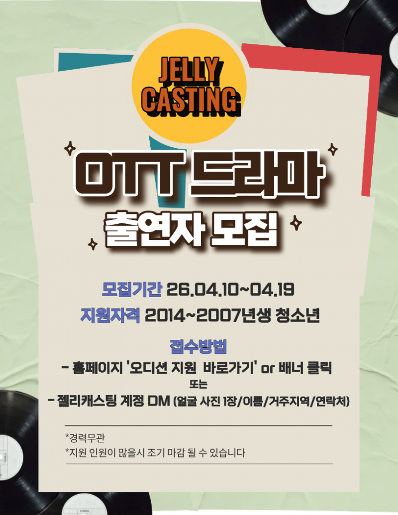 젤리캐스팅 공식계정 DM (얼굴 사진 1장/이름/거주지역/연락처)